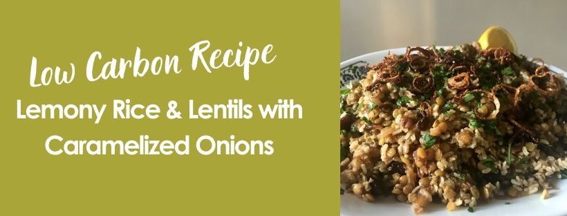 Rice and lentils are a classic combo in diets around the world and are great staples in a plant-based diet. This recipe, inspired by the middle eastern dish Mujadara, is a delicious savoury dish that gets it’s flavour from caramelized onions, raisins, and warm spices. Lentils have a low carbon footprint (1kg = 1kg of GHG emissions), as do onions (5.8 kg = 1 kg of GHG emissions) compared to other food sources like beef (38g = 1kg of GHG emissions).